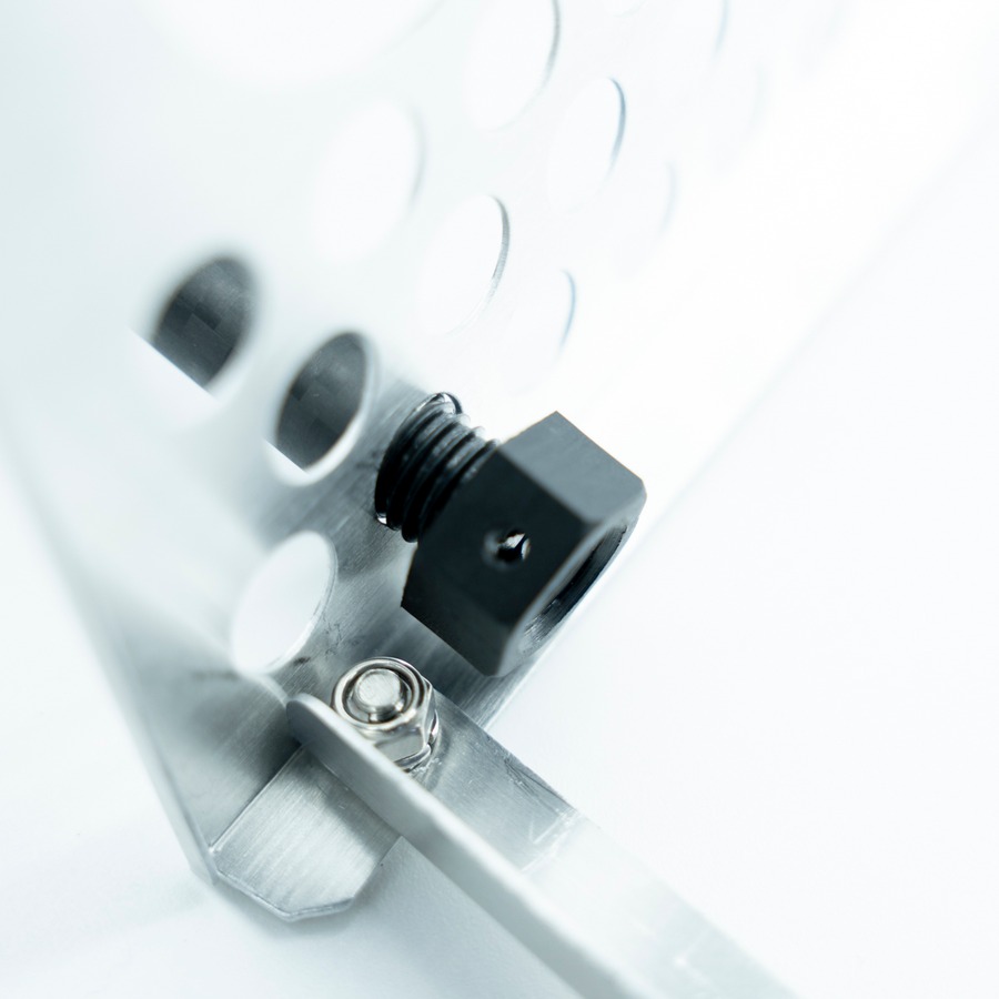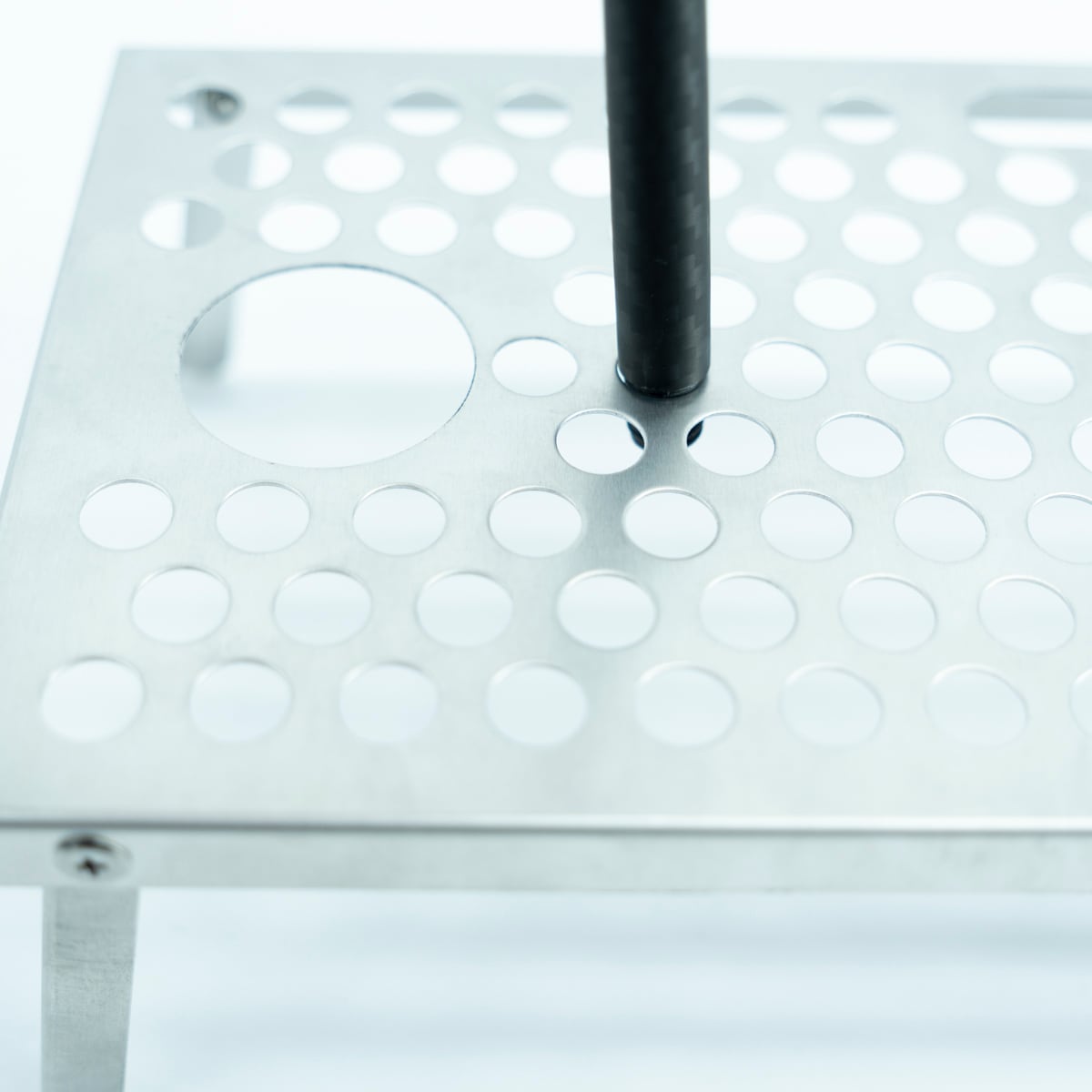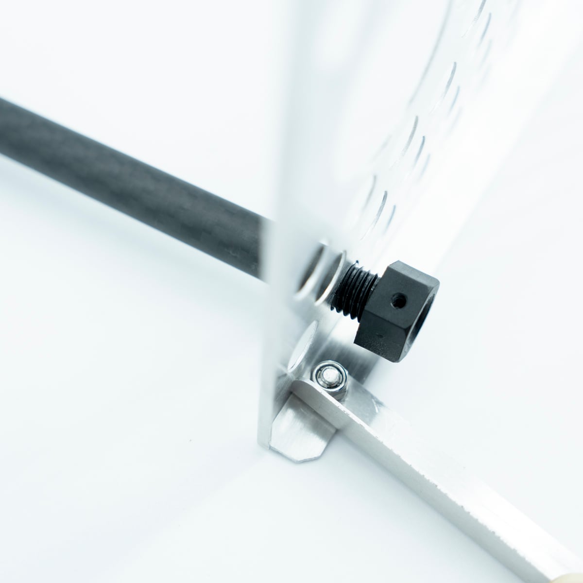 ULマルチテーブルの天板に設けられたパンチ穴に、カーボン支柱を差し込み、裏側から六角ナットで締めるだけでセットできます。