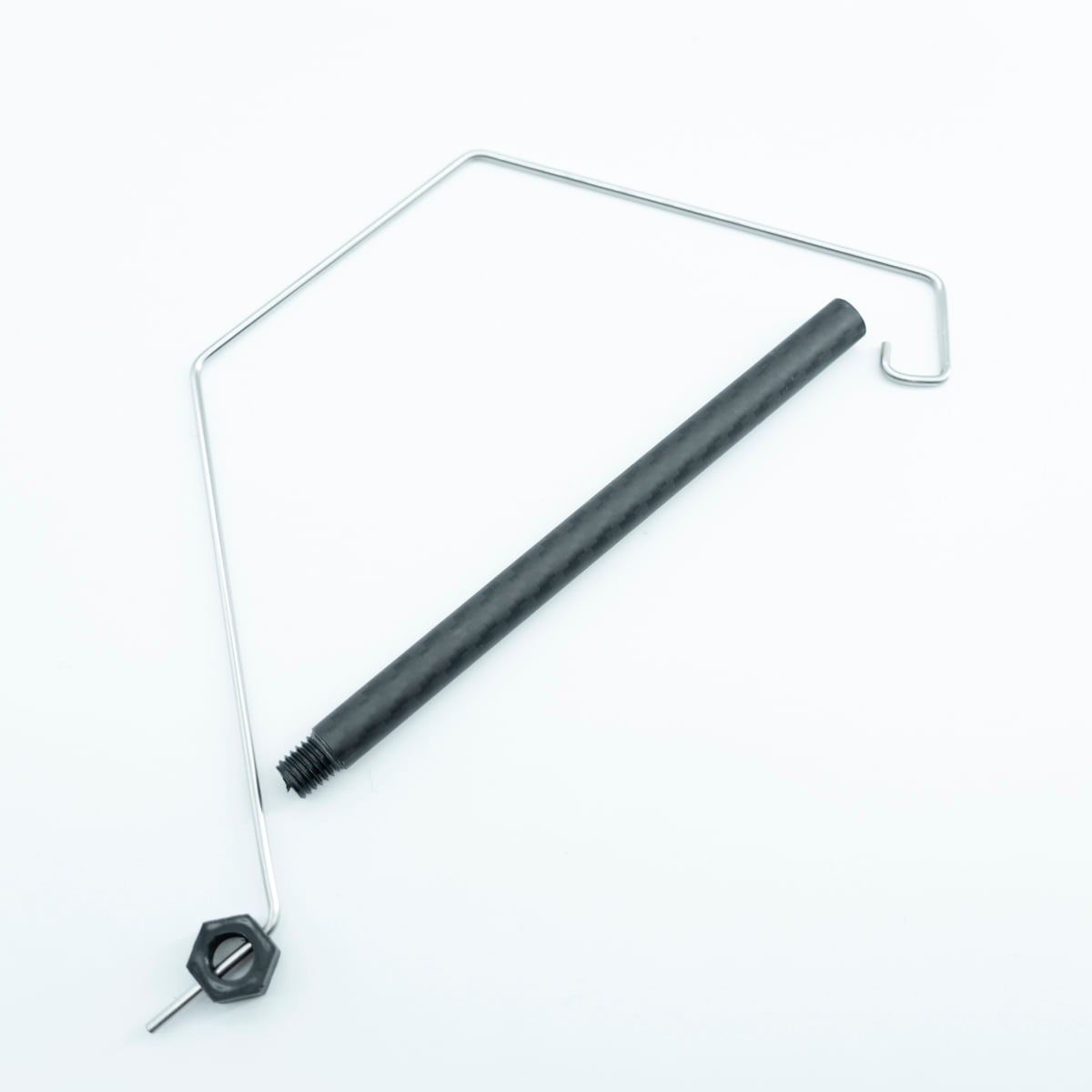 カーボン製の支柱、ナイロン樹脂製の六角ナット、ステンレス製のハンガーの3つからなるシンプルなランタンスタンドです。