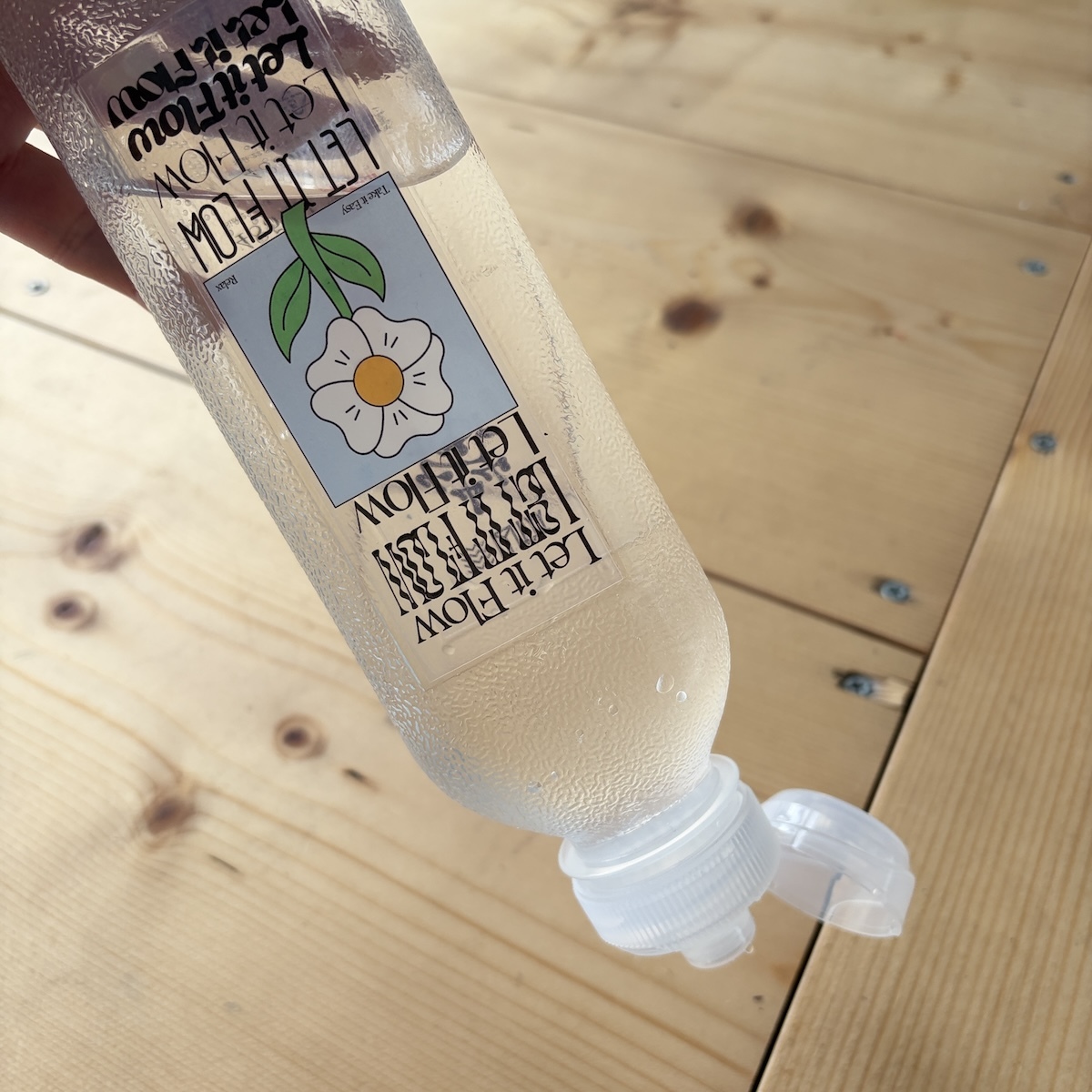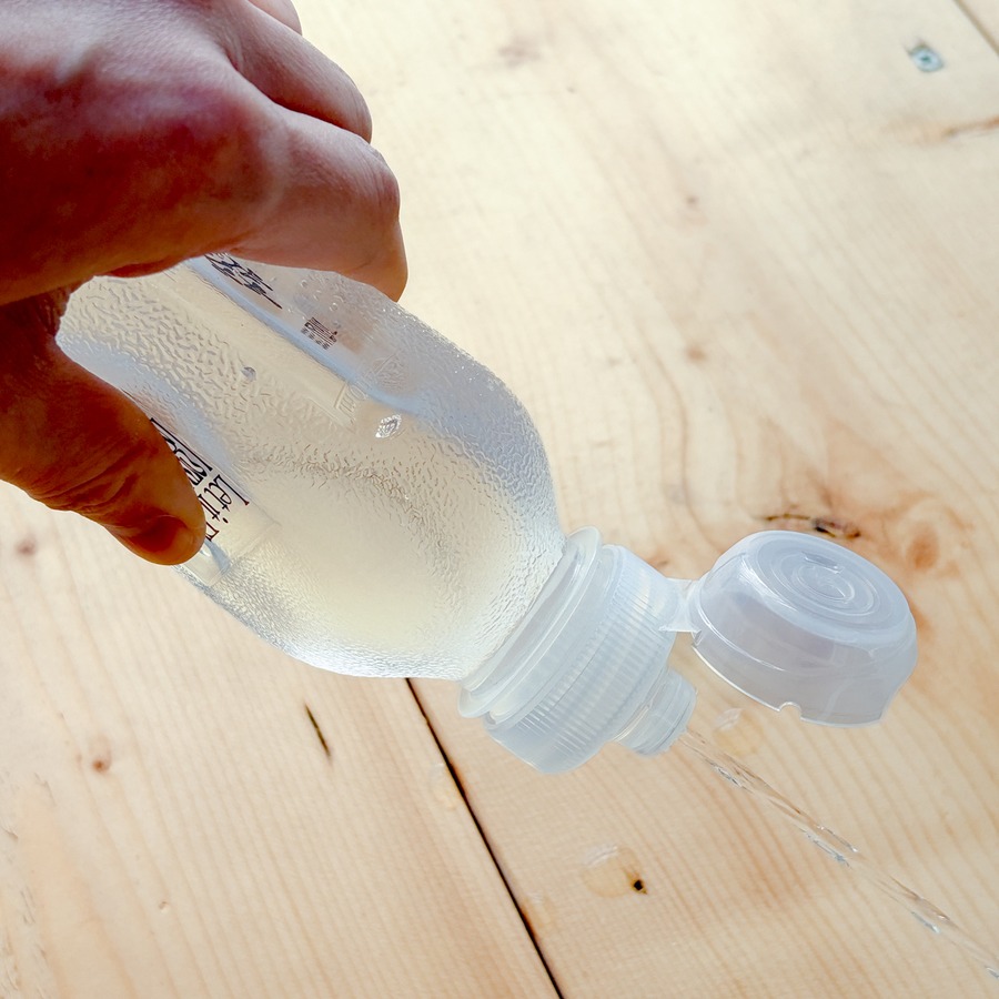 ボトルを逆さまにしても水が漏れません。山で大切な水をこぼすことなく、大事に扱えます。水はボトルを押したり口で吸うことで出ます。