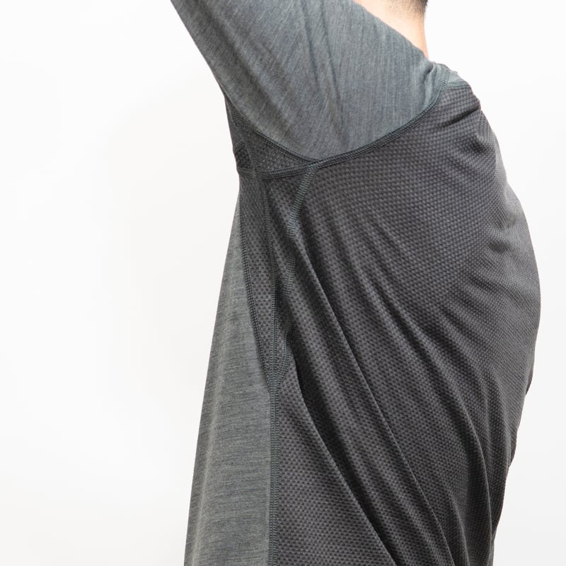このTシャツの最大の特徴は、最も汗をかくとされている背中、脇にメリノウール50%、化繊50%のメッシュ生地が施されていることです。