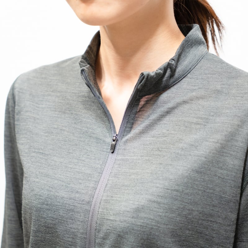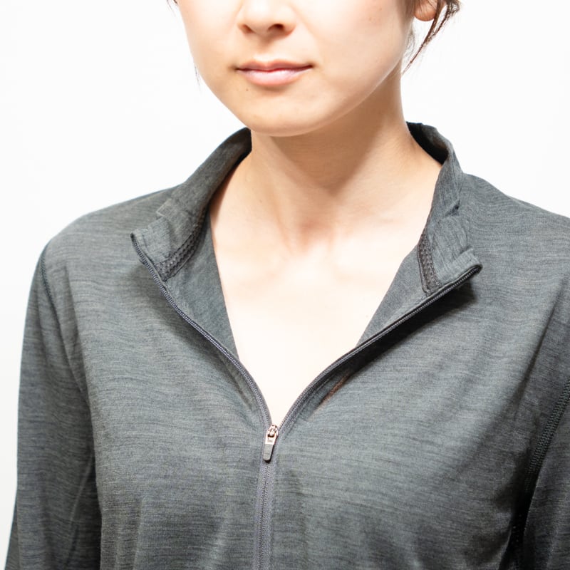 ジッパーは約33cmと長めに設計されており、体温が上がったときには素早く熱を逃がすことが可能。さらに、ジッパーが肌に直接当たらないよう工夫されたデザインで、ベースレイヤーとしての快適性を最大限に高めています。