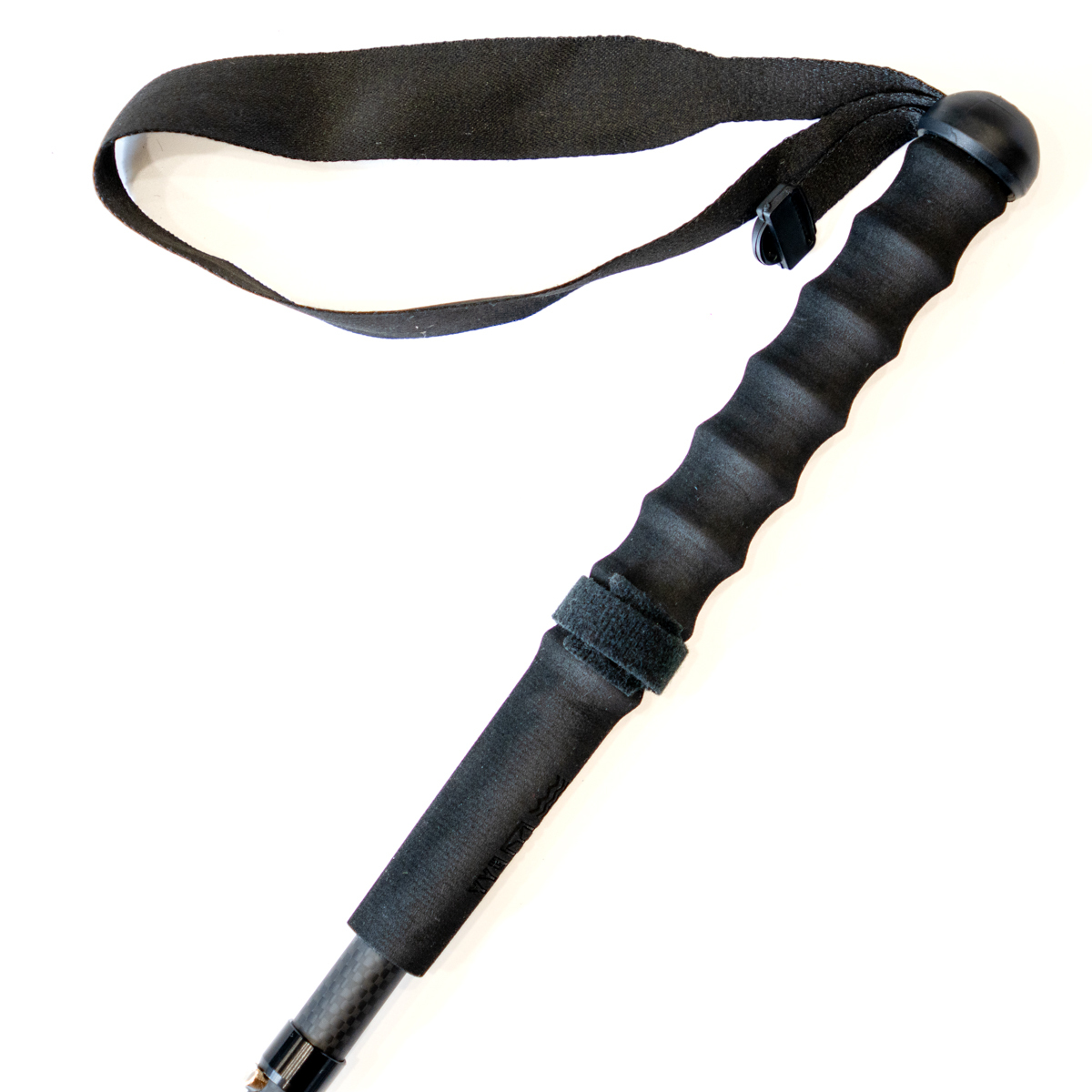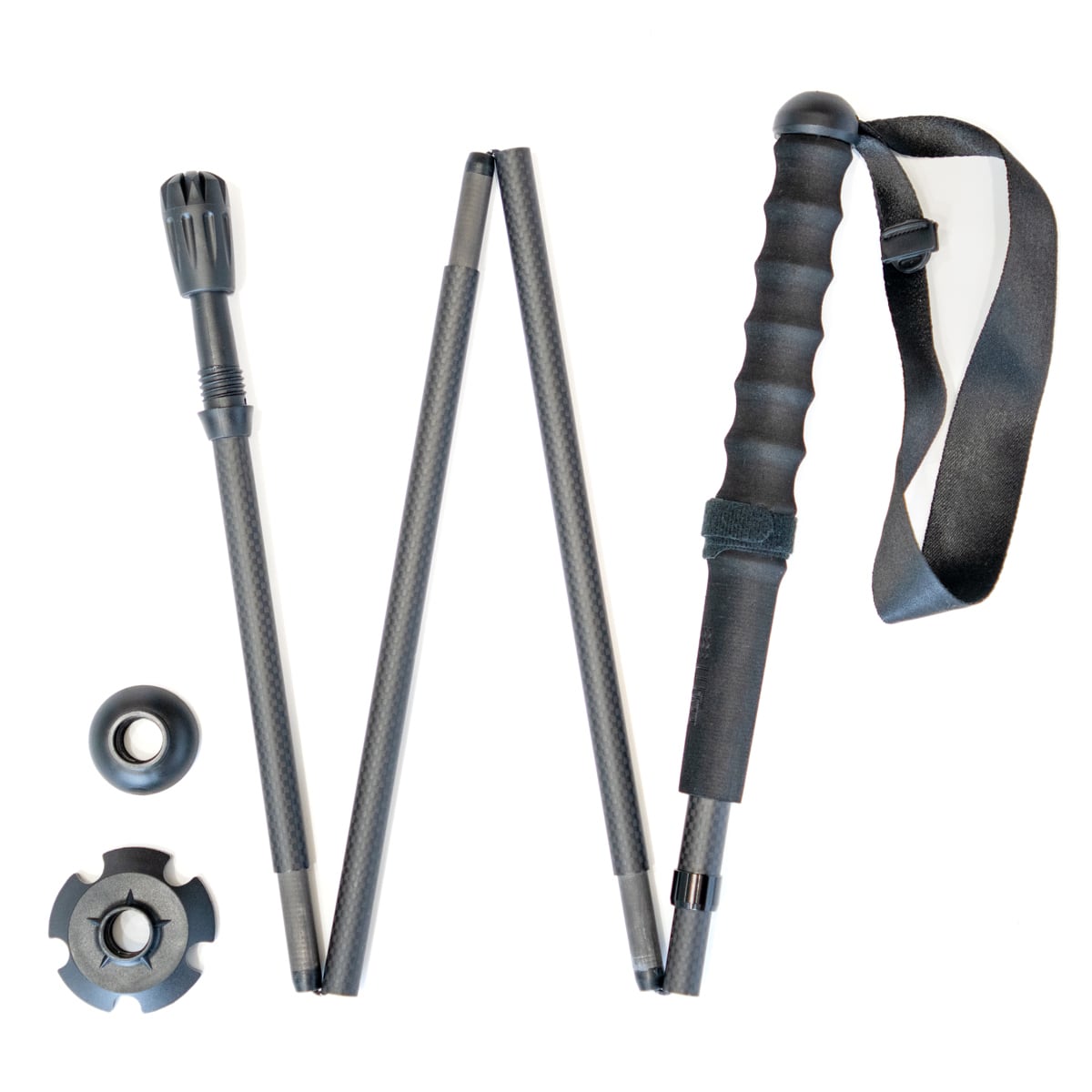 3Kカーボンによる高い剛性、4つ折りによる短い仕舞寸法、軽量性を備えたカーボン製トレッキングポールです。1本での販売です。