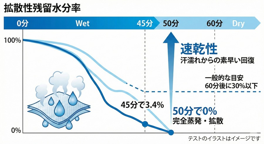 45分で3.4%50分で0%一般的な目安である「60分後に30%以下」を大きく上回る速乾性です。50分で水分が完全に蒸発・拡散しており、汗濡れからの素早い回復を示しています。