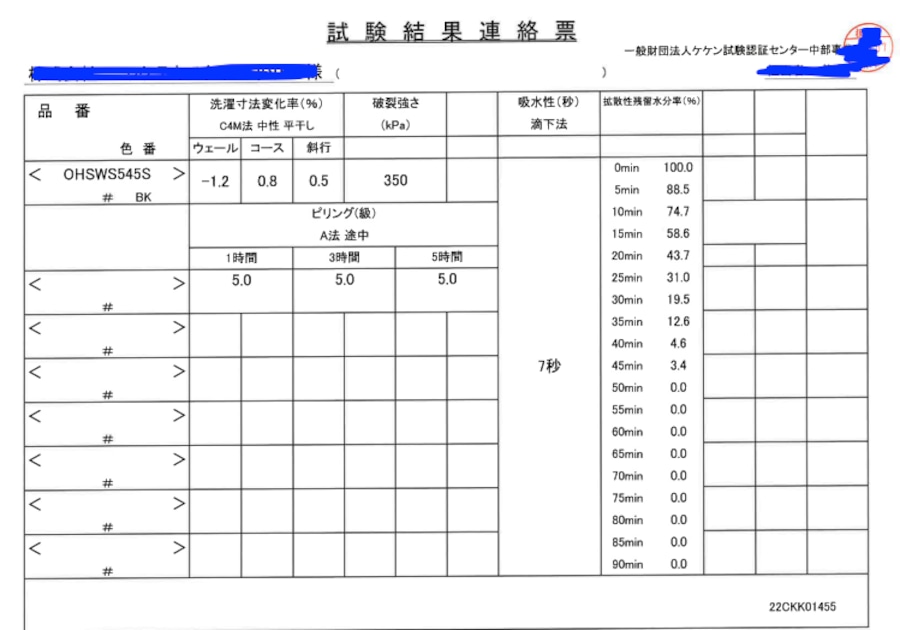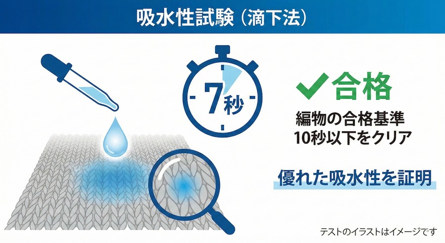 7秒編物(ニット等)の合格基準である「10秒以下」をクリア。純水が生地に完全に吸収されるまでの時間が非常に短く、優れた吸水性を証明しています。