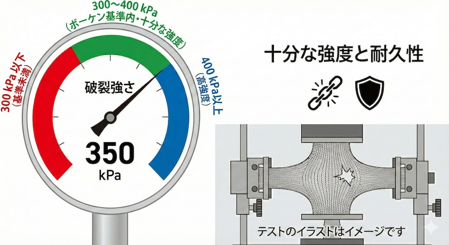 350kPaボーケン基準などでニット生地の強度指標とされる300〜400 kPaの中間に位置し、十分な強度と耐久性を備えています。