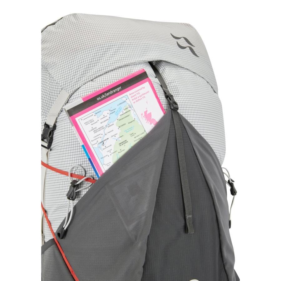 両サイドのメッシュポケットは、大型ボトルが余裕で入るだけでなく、斜めにカッティングされているため、立ったままでも無理なくボトルに手が届きます。また、フロントの大型メッシュポケットには、濡れたテントや脱いだレインウェアなどを雑に押し込むことができ、スピーディな撤収をサポートします。これらの摩擦が起きやすい箇所もしっかりとSpectra®ファイバーで補強されている点に、作り手の細やかな配慮が感じられます。