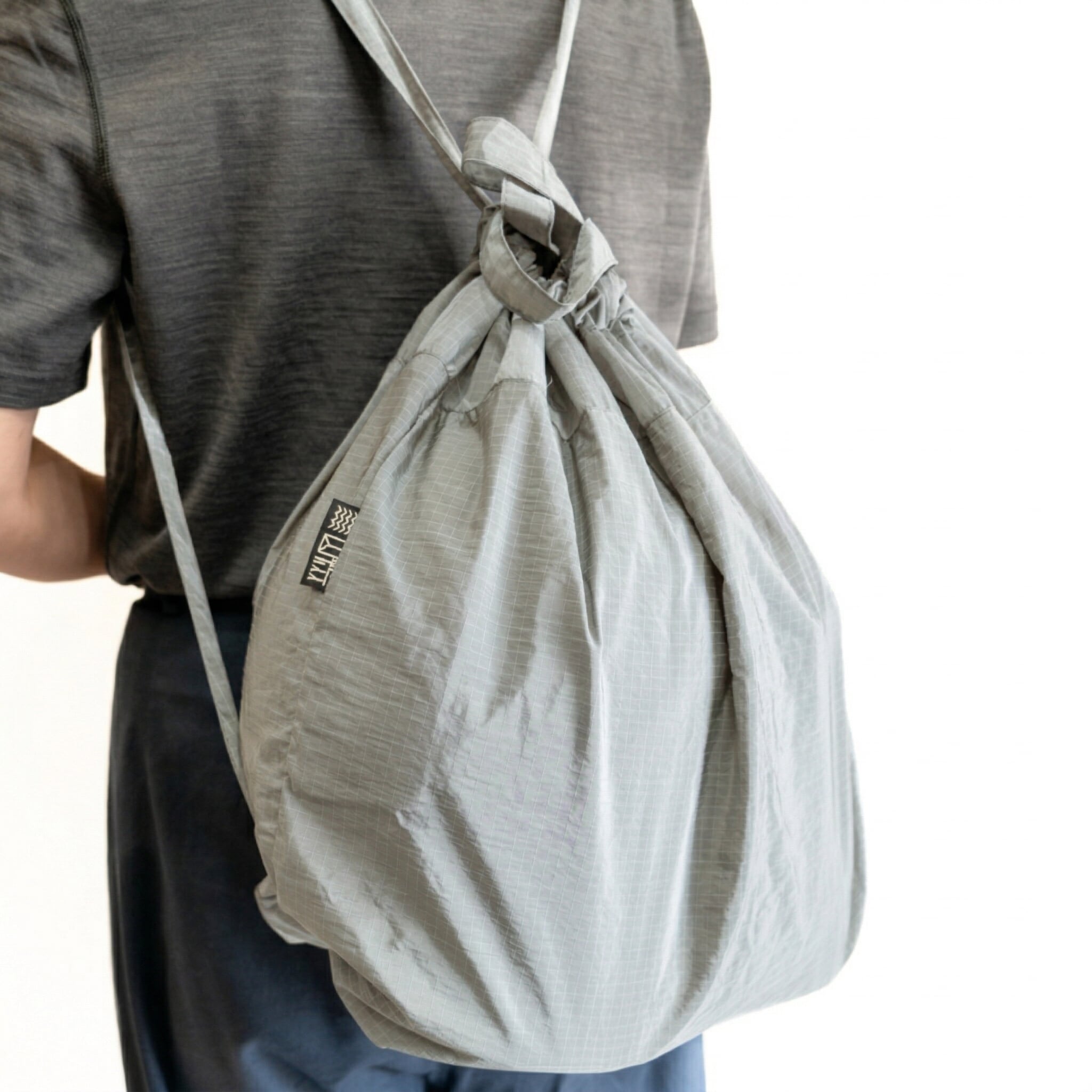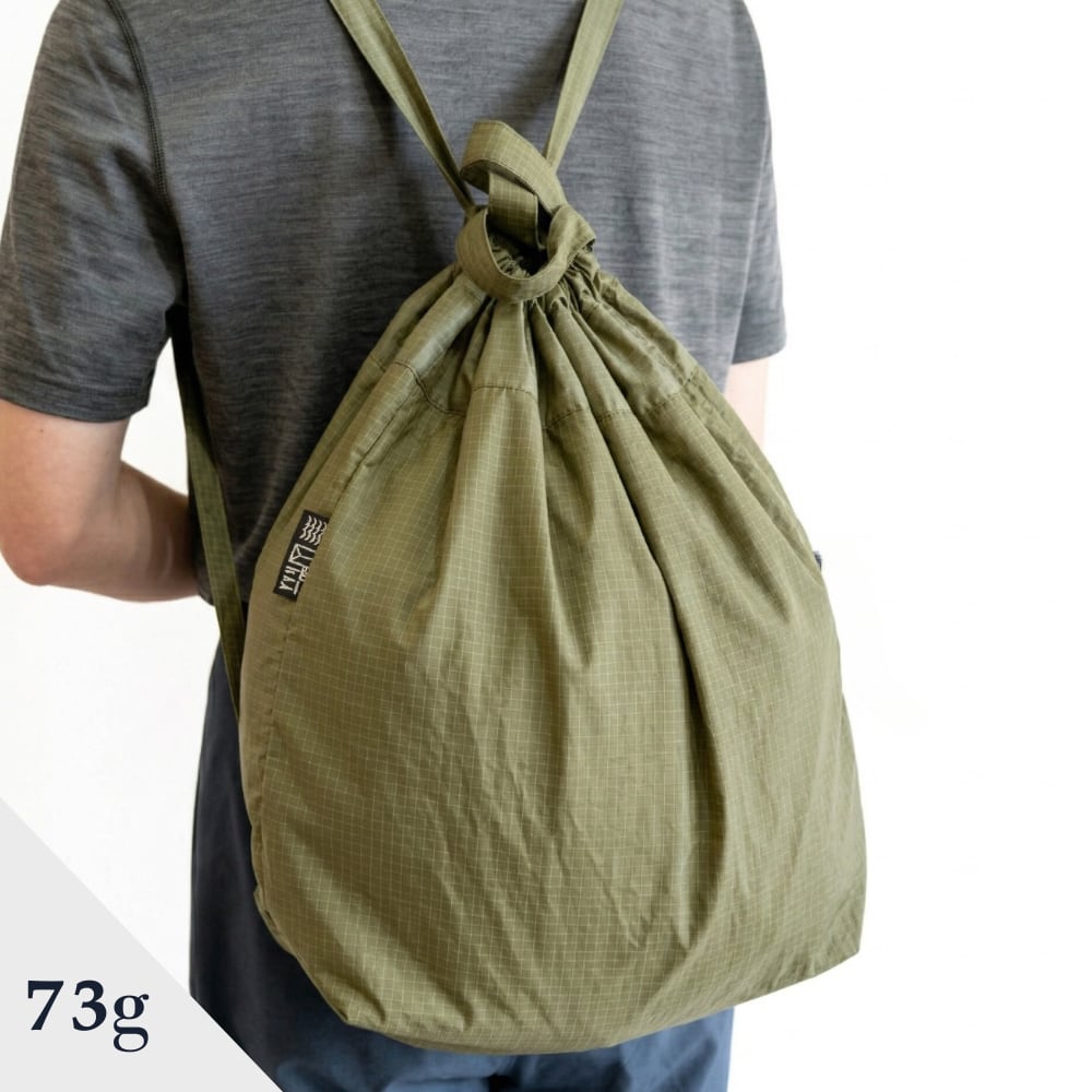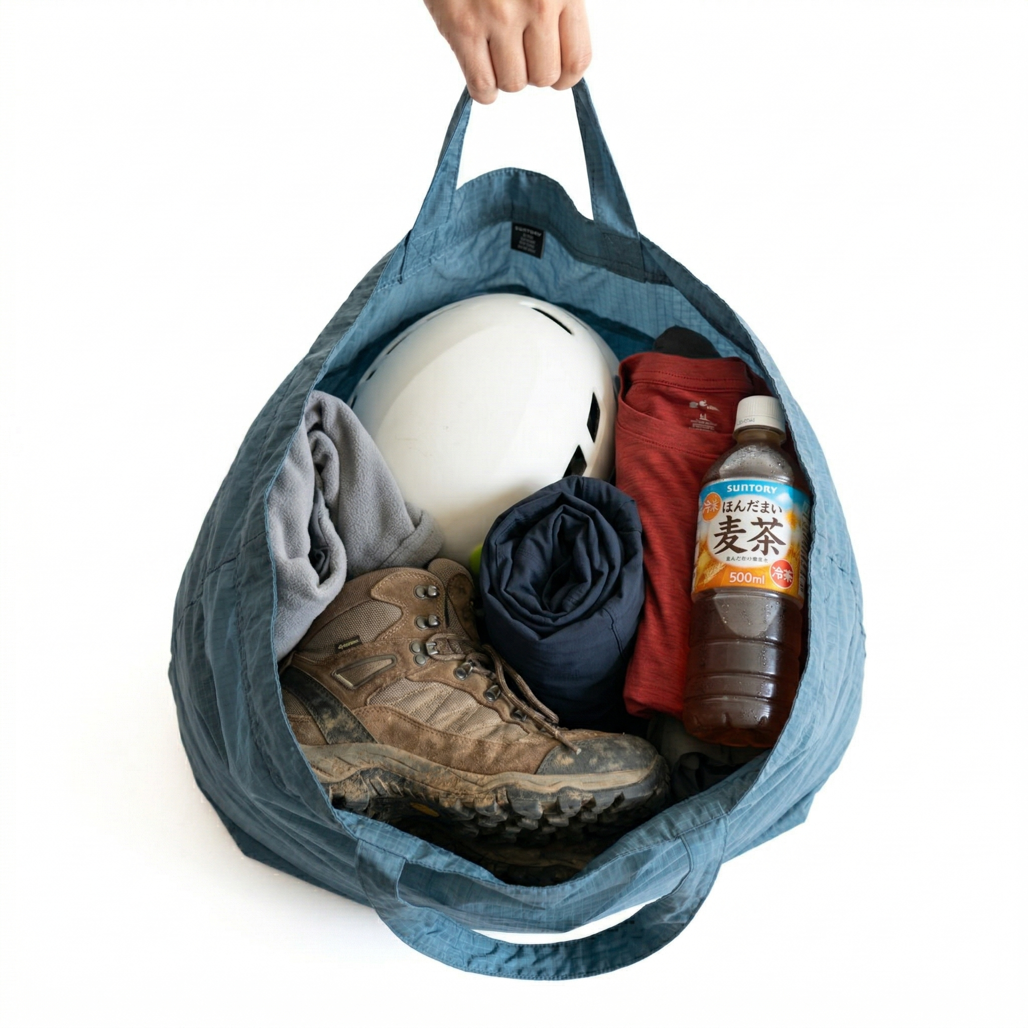 モノフィラメント・リップストップ素材で手提げ、背負うの2way仕様のトートバッグです。登山靴、スキーブーツ、トレイルランニングシューズ、着替え、ヘルメット、日帰り登山ザック、トレイルランニングザック一式を収納できる大きなサイズのトートバッグです。