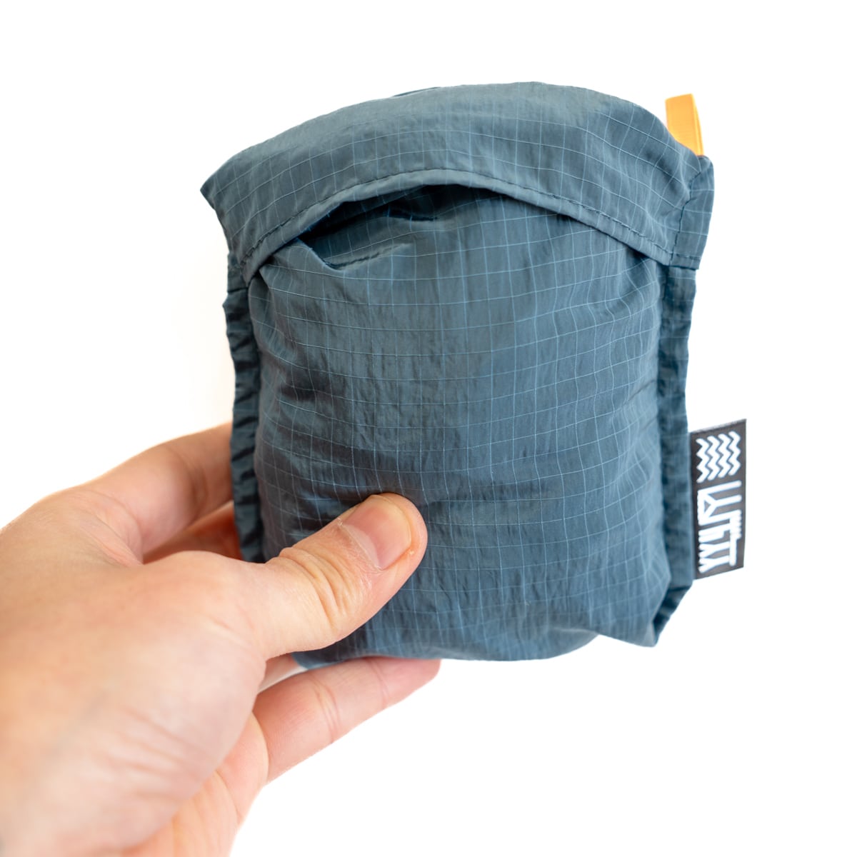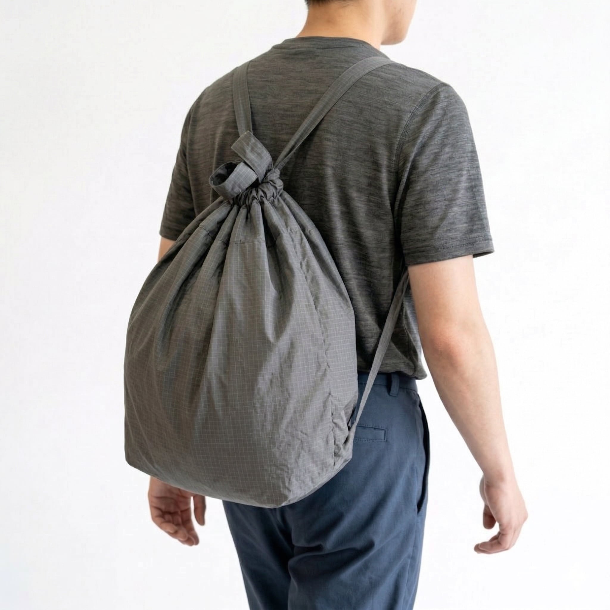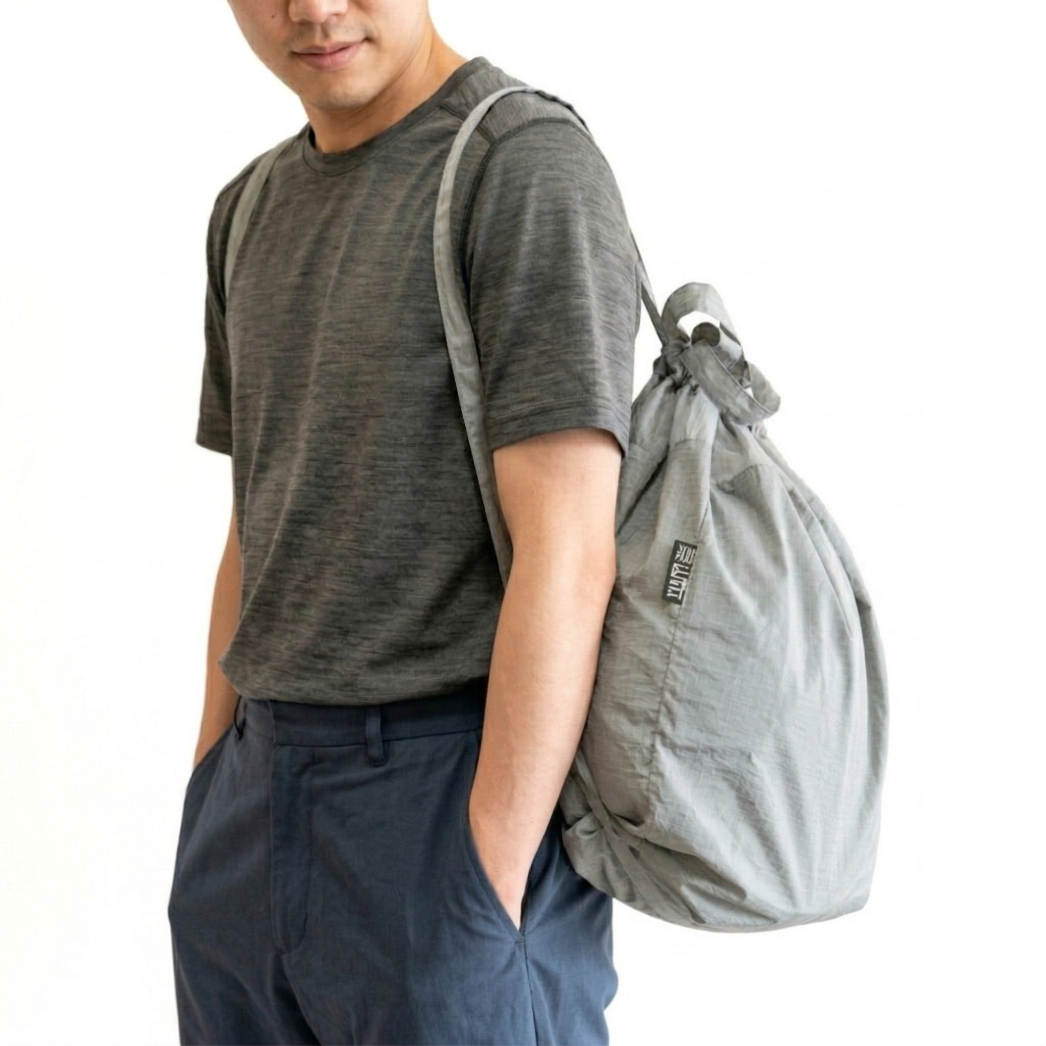 モノフィラメント・リップストップ素材で手提げ、背負うの2way仕様のトートバッグです。登山靴、スキーブーツ、トレイルランニングシューズ、着替え、ヘルメット、日帰り登山ザック、トレイルランニングザック一式を収納できる大きなサイズのトートバッグです。