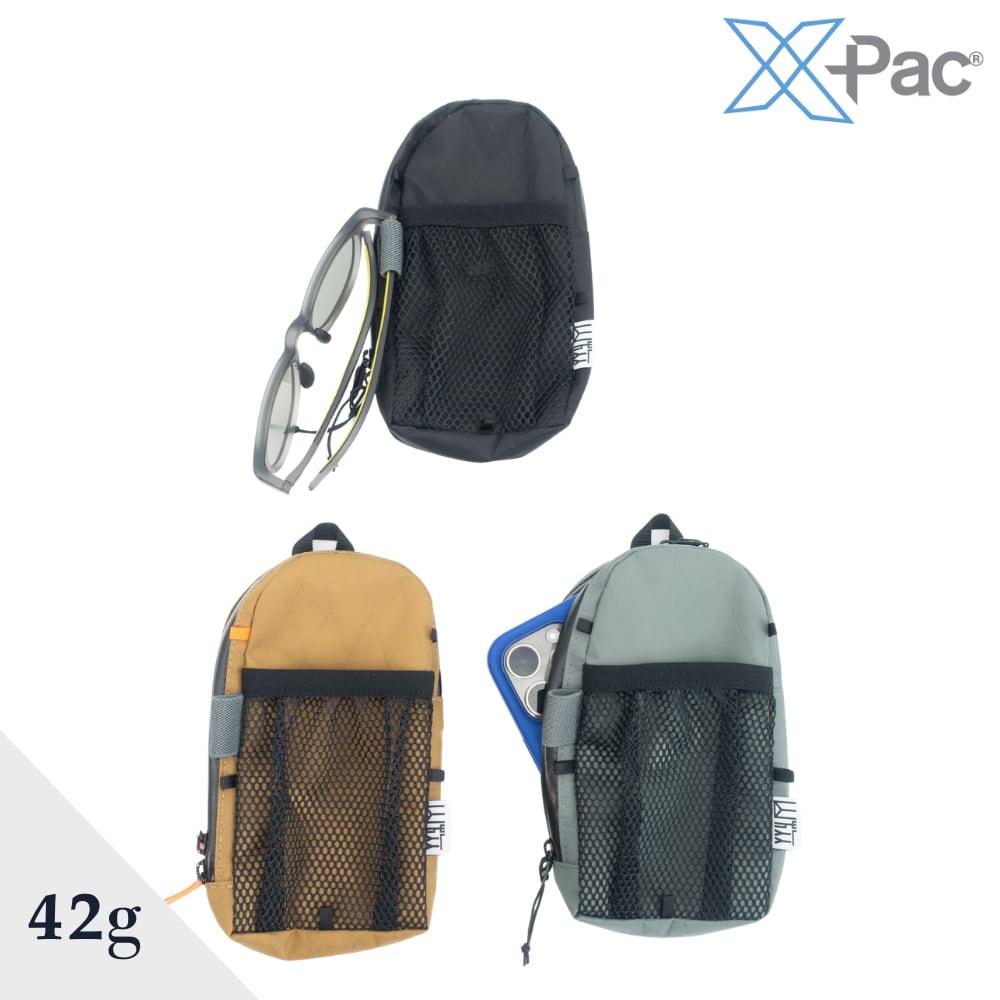 スマートフォン、サングラス、財布や小物、地図などを収納し、バックパックのショルダーハーネスに装着できる、X-PAC製の軽量ポケットです。