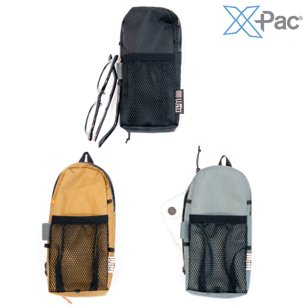 スマートフォン、サングラス、財布や小物、地図などを収納し、バックパックのショルダーハーネスに装着できる、X-PAC製の軽量ポケットです。Lサイズなので大きなスマホ、モバイルバッテリーを収納するのに適しています。