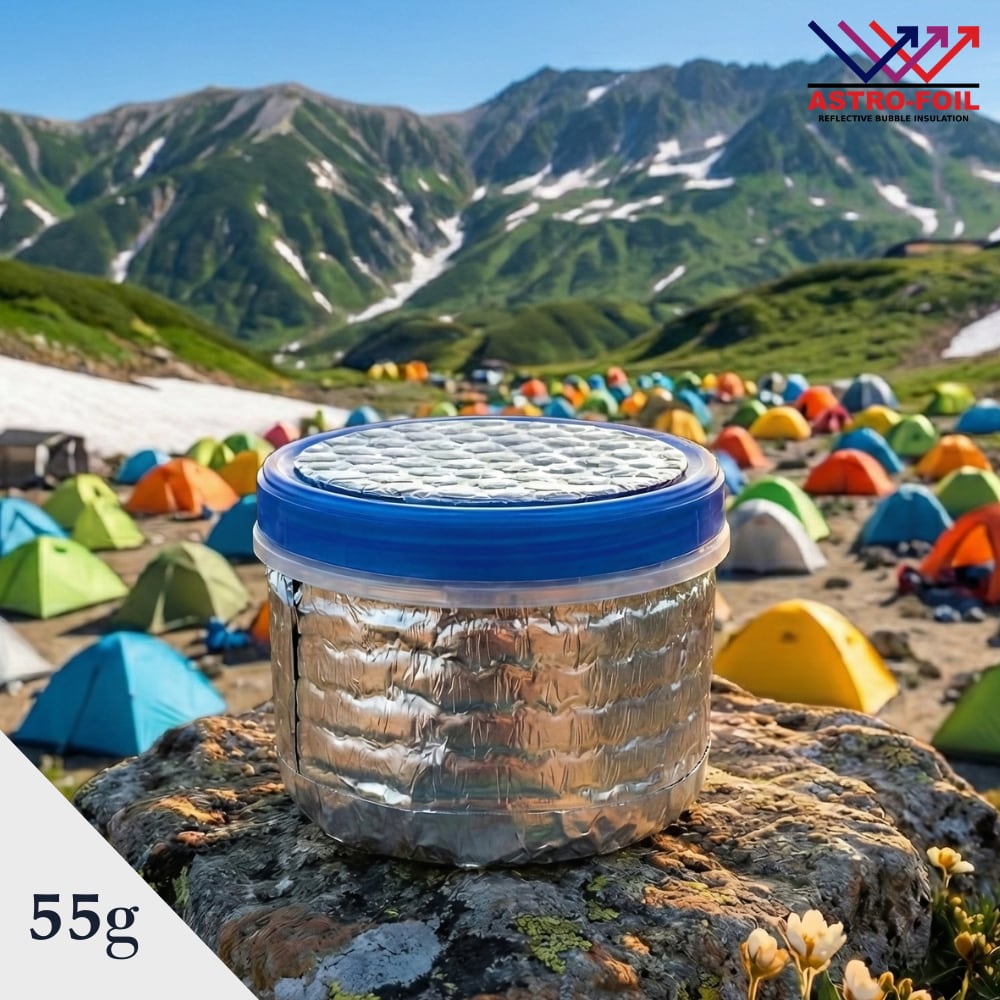 素材のアストロフォイルは、スクリューロックの中に入れた熱源を中に蓄えて保温します。また外気を断熱し冷めづらくなります。