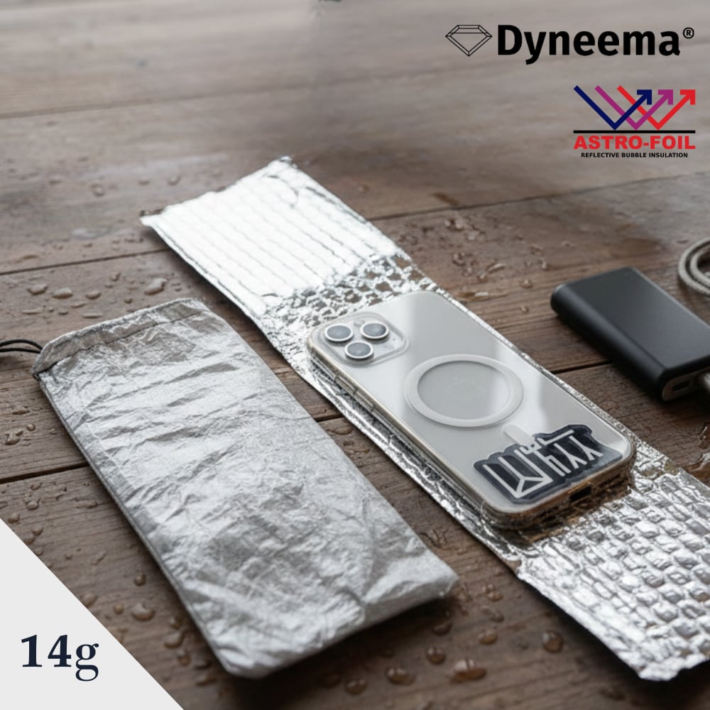 スマートフォンやモバイルバッテリーが極端に冷えることで、電圧が下がりパフォーマンス低下を招きます。このケースはアストロフォイルでスマホやモバイルバッテリを包んだ後にダイニーマケースに収納し、電圧低下を一時的に防ぐためのケースです。