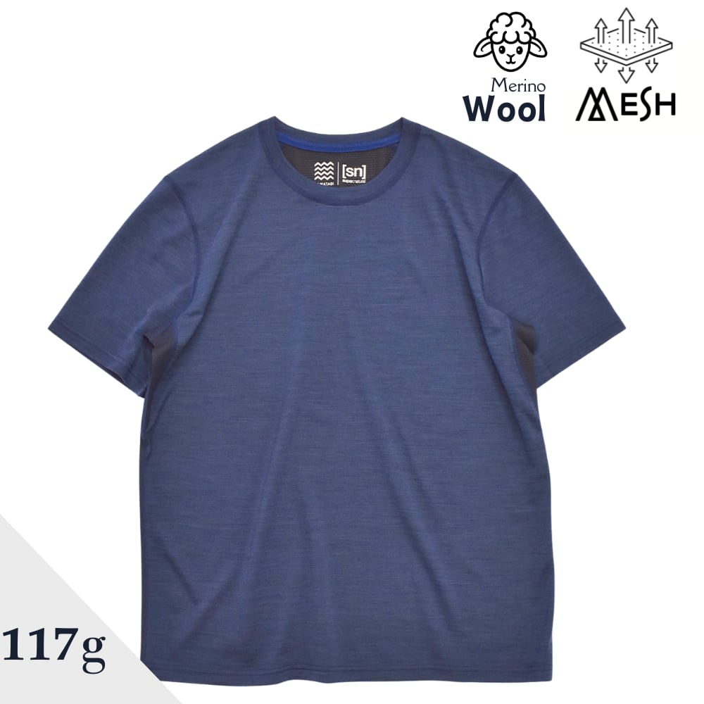 このTシャツの最大の特徴は、最も汗をかくとされている背中、脇にメリノウール50%、化繊50%のメッシュ生地が施されていることです。