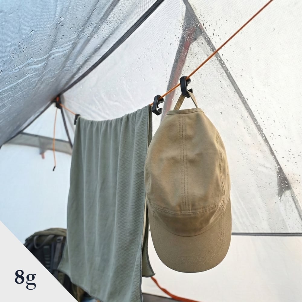 テントの天井部や木々の間などを活用して、様々なもの吊るすことができるシステムです。キャップやタオルなどを乾燥させるために、ランタンを自由な位置に吊るしたり、無くしがちな小物を吊るすなど使い方は様々です。