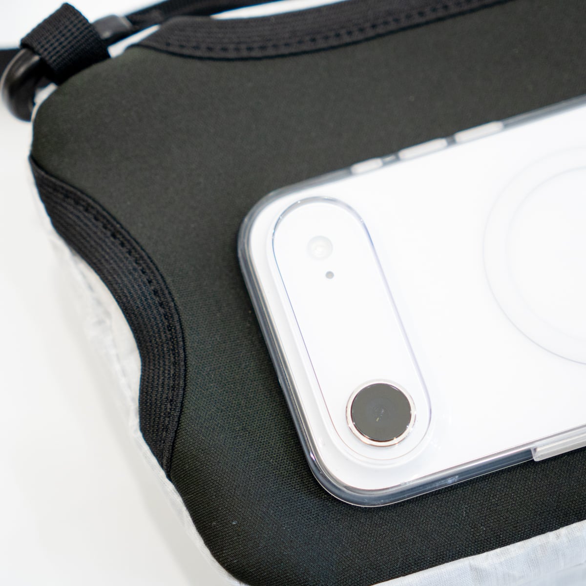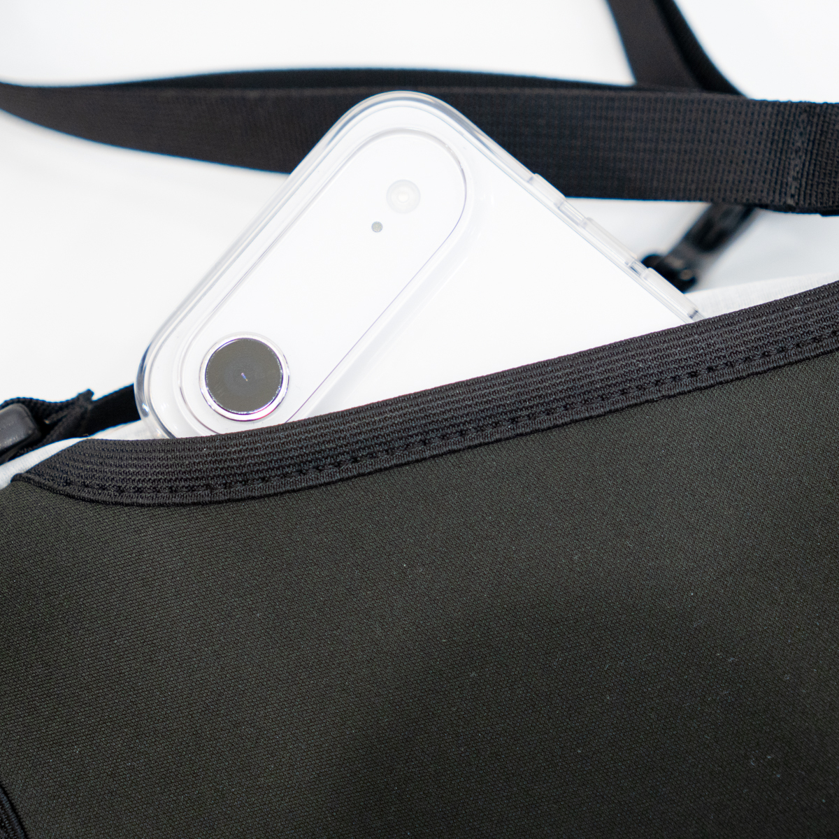 体側には様々なサイズのスマートフォンを入れておくのに便利なポケットが備わっており、体に当たる部分の素材はクッション性と通気性を備えたストレッチ素材で優しく体にフィットします。スマートフォンのバイブが気づきやすいようにデザインされています。