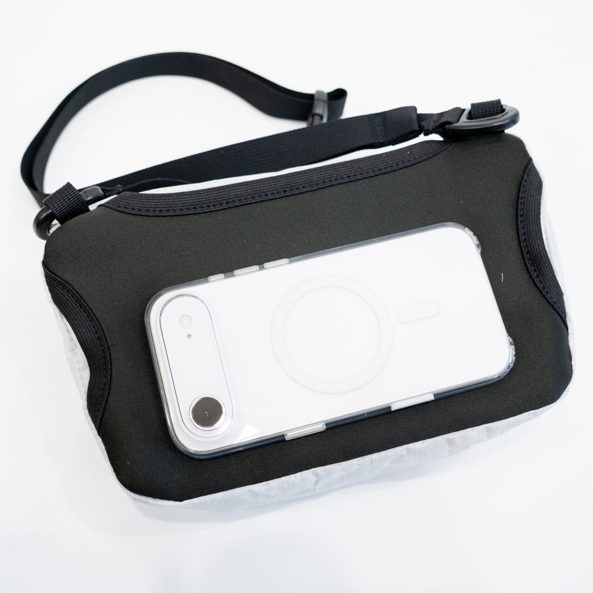 ストラップはサコッシュ本体から取り外すことができ、スマホポケットの左右についたホールにザックのチェストベルトを通すことでザック容量の拡張を行うことができます。