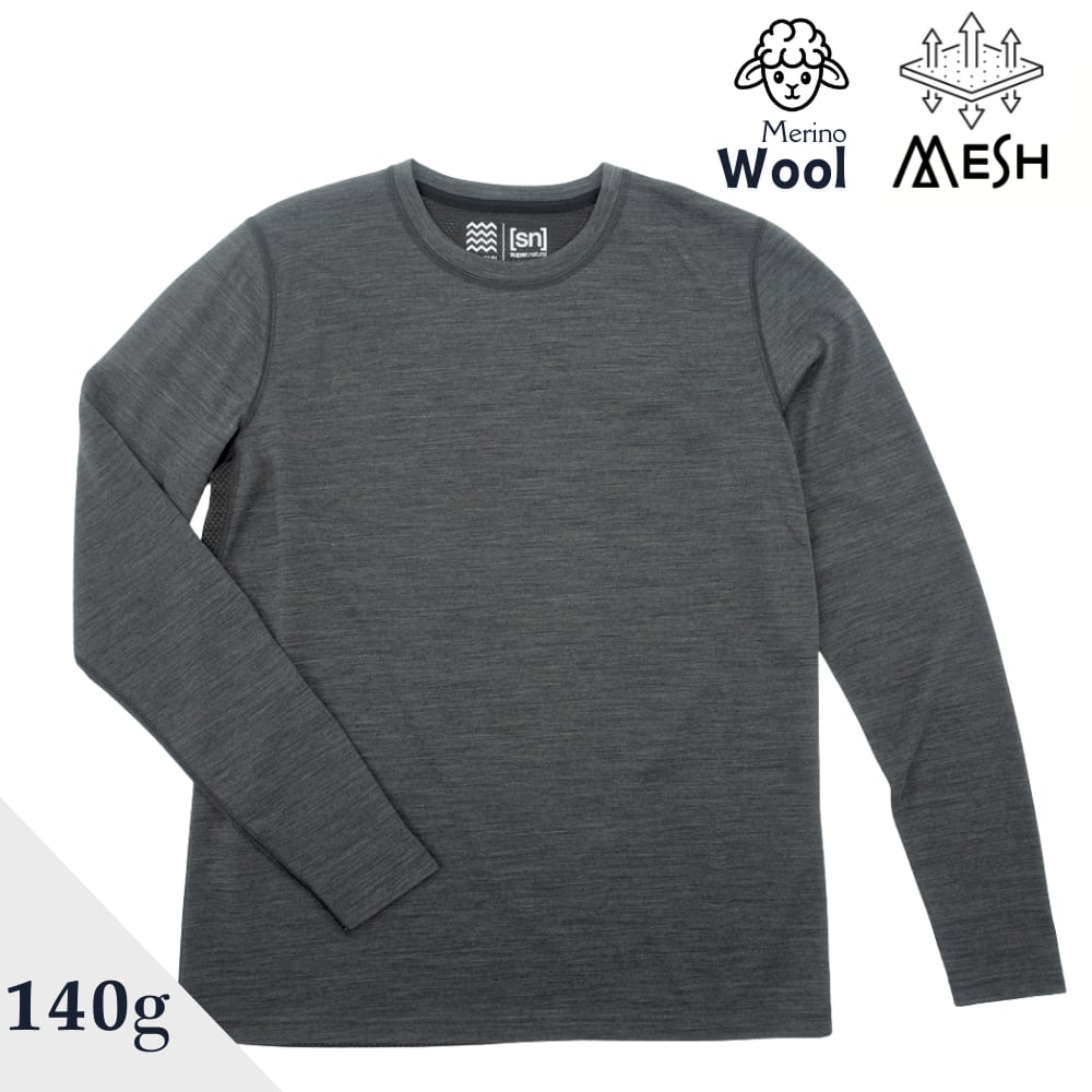 メリノウール50%、ポリエステル50%の速乾メリノウールをベースに、背中全体と脇部分にはより乾きの早いメリノウール50%、ポリエステル47%、ポリウレタン3%のメッシュを備え、発汗量の多いアクティビティで快適性を維持し続けるベースレイヤーです。