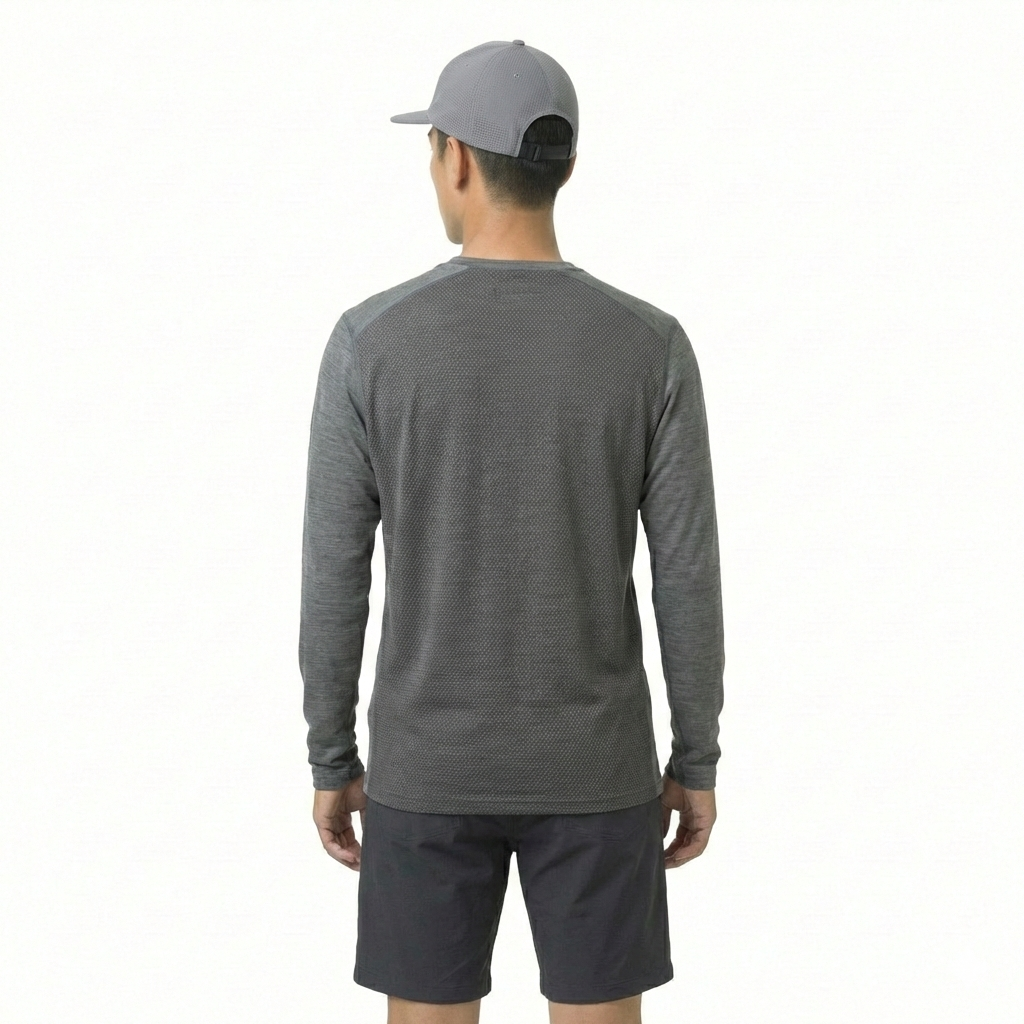 メリノウールが持つ消臭効果と保温性。ポリエステルの速乾性と耐久性を備えているため、登山、トレイルランニングでの使用に適したメリノウールロングスリーブシャツです。