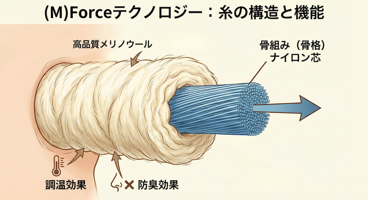 (M)Forceテクノロジーとはナイロン・コア・テクノロジーのことを言います。このテクノロジーの構造はナイロンフィラメントにメリノが巻き付けられています。